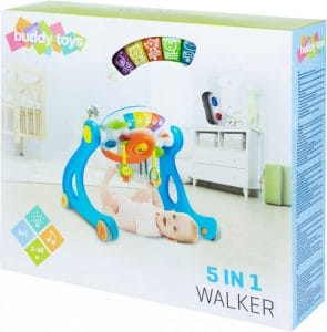Chodítko BBT 6020 od výrobce Buddy Toys vaše miminko využije již od raného věku, kdy začíná vnímat věci kolem sebe a zkouší natahovat ručičky po hračkách, které mu s radostí ukazujete. Ještě ani nemusí umět sedět a už doma najde své uplatnění. Jak už z názvu 5v1 vyplývá, jedná se nejen o chodítko, ale také o multifunkční hračku, se kterou si vaše miminko vyhraje opravdu dlouhou dobu již od malička. Skládá se z herního pultíku s pevnou rukojetí a dvou robustních nohou s kolečky, které obsahují bezpečnostní zámky proti nechtěnému rozjetí. Na pultíku vaše miminko najde spoustu zajímavých interaktivních prvků: houkačku, řadicí páku, bezpečné zrcátko, mobil, klíč, pohyblivé kolečko a v neposlední řadě piáno s pěti různobarevnými klávesami, které se při stisknutí rozsvítí a zahrají vašemu děťátku příjemnou melodii nebo zvuk zvířete. Chodítko je vhodné: