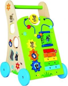 Na zadní / vnitřní straně je zavěšen síťový koš, ve kterém si vaše malé může vozit spoustu hraček a drobností. Celkově je vyrobeno tak, aby se vaše dítě všestranně rozvíjelo – pomáhá nejen s prvními nejistými krůčky, ale také s hrubou a jemnou motorikou, s technickým a logickým myšlením a působí na sluchové vnímání. Drobným nedostatkem může být fakt, že ho zakoupíte ve zcela rozloženém stavu. Jedná se o dřevěné chodítko, musíte vzít tedy do ruky šroubovák a s množstvím šroubků si poradit sami. Šikovný tatínek i zdatná maminka to ale jistě zvládne! Výrobce má nejen na toto chodítko, ale i na všechny své další dřevěné hračky zdravotní atest a splňuje všechny nařízené normy EU.