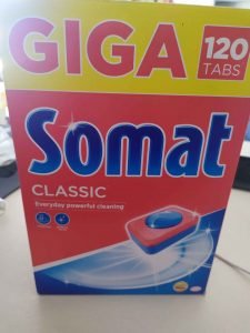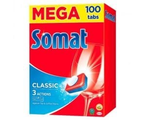 Tablety Somat classic představují pouze mycí přípravek, pro dokonale umyté nádobí je potřeba do myčky přidat ještě sůl a leštidlo – nejlépe značky Somat. Kombinace těchto tří přípravků si hravě poradí se skvrnami od čaje a kávy, chrání sklo a mají efekt schnutí. Perfektně odstraní veškerou mastnotu a navíc také působí proti zápachu. Tablety obsahují méně škodlivé fosfonáty, takže jejich použitím tolik nezatěžujete životní prostředí. Po umytí bude vaše nádobí lesklé a čisté. Oproti multifunkčním tabletám jsou Somat tablety levnější a navíc je můžete zakoupit v XXL balení, za ještě výhodnější cenu.