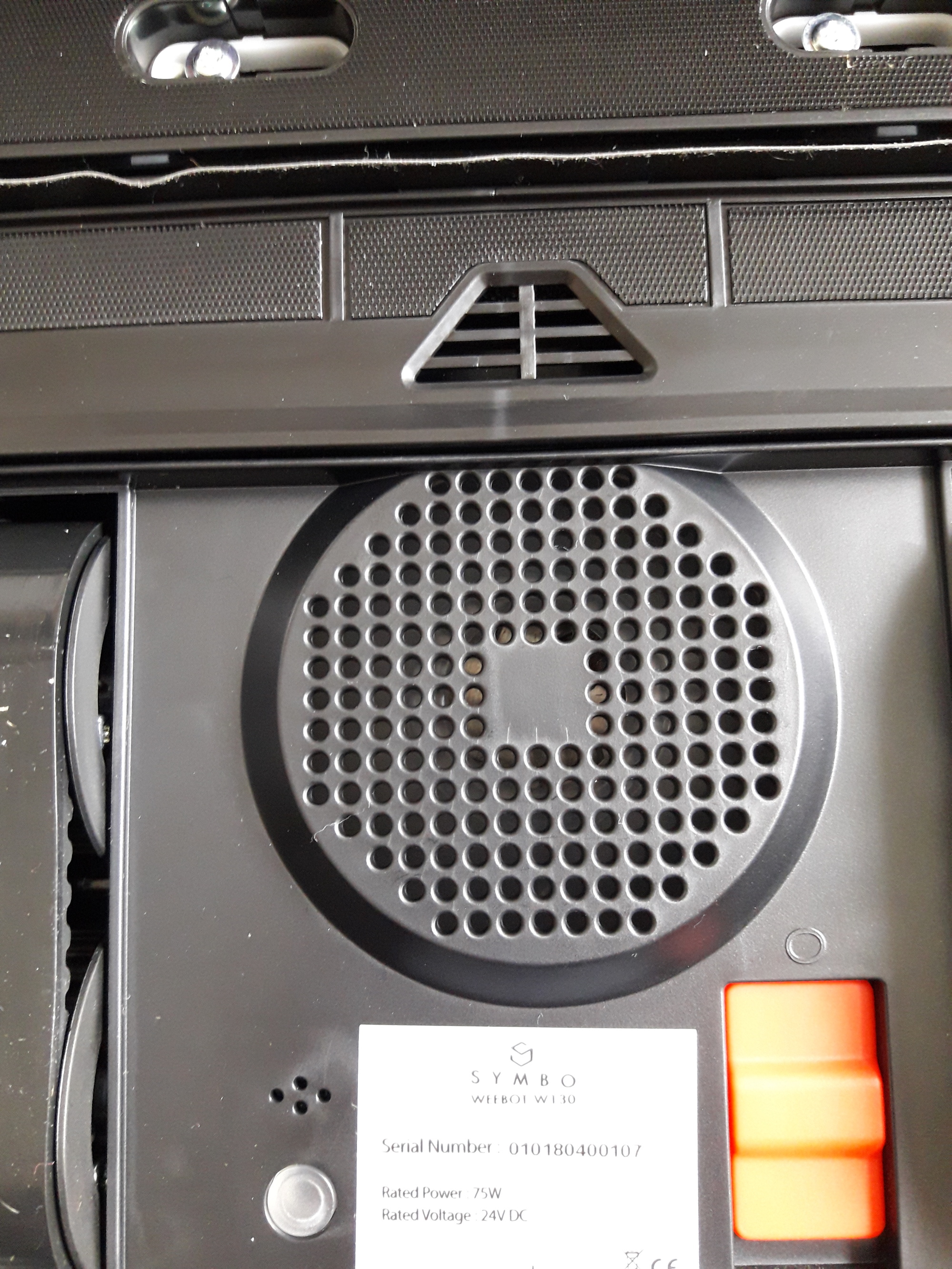 Na spodní straně vysavače najdete dva pásy, kterými se vysavač po okně pohybuje, dále mřížku podtlakového ventilátoru, tlačítko pro zapnutí a vypnutí, senzory a části opatřené suchými zipy, na které se připevňují čisticí podložky. Vzhledem k tomu, že vysavač okno myje mokré, stírá okno jemnou gumovou stěrkou, kterou také najdete na spodní straně vysavače.
