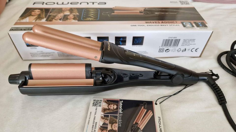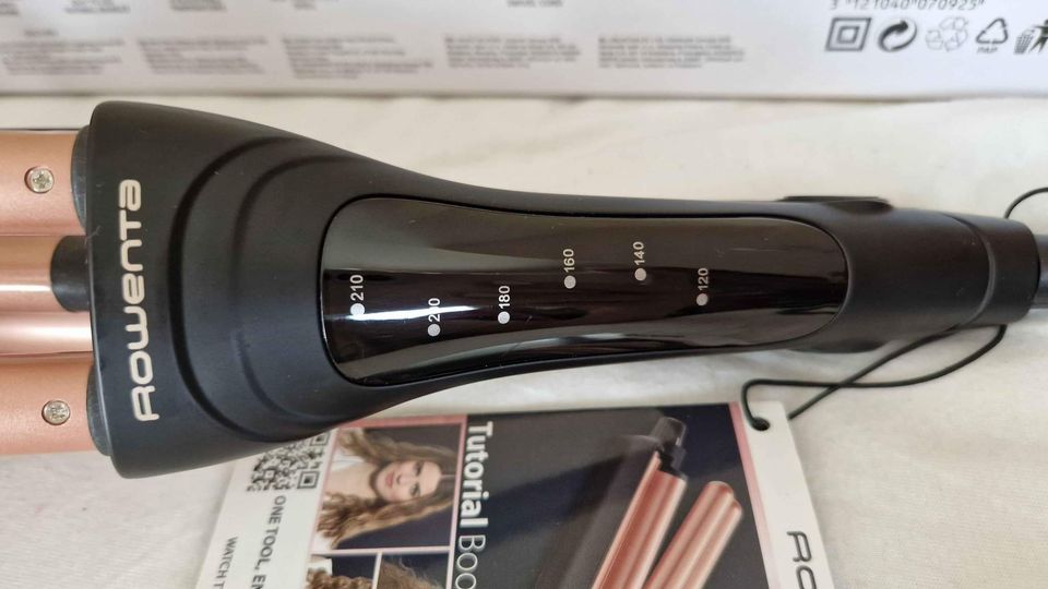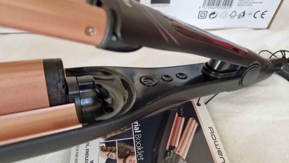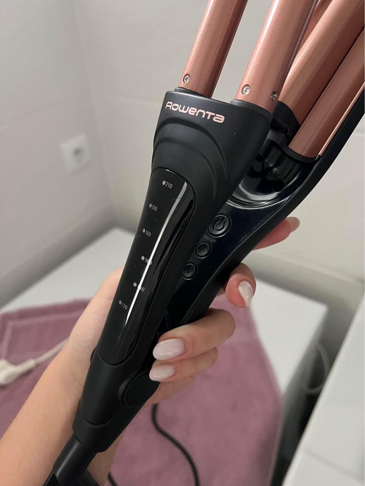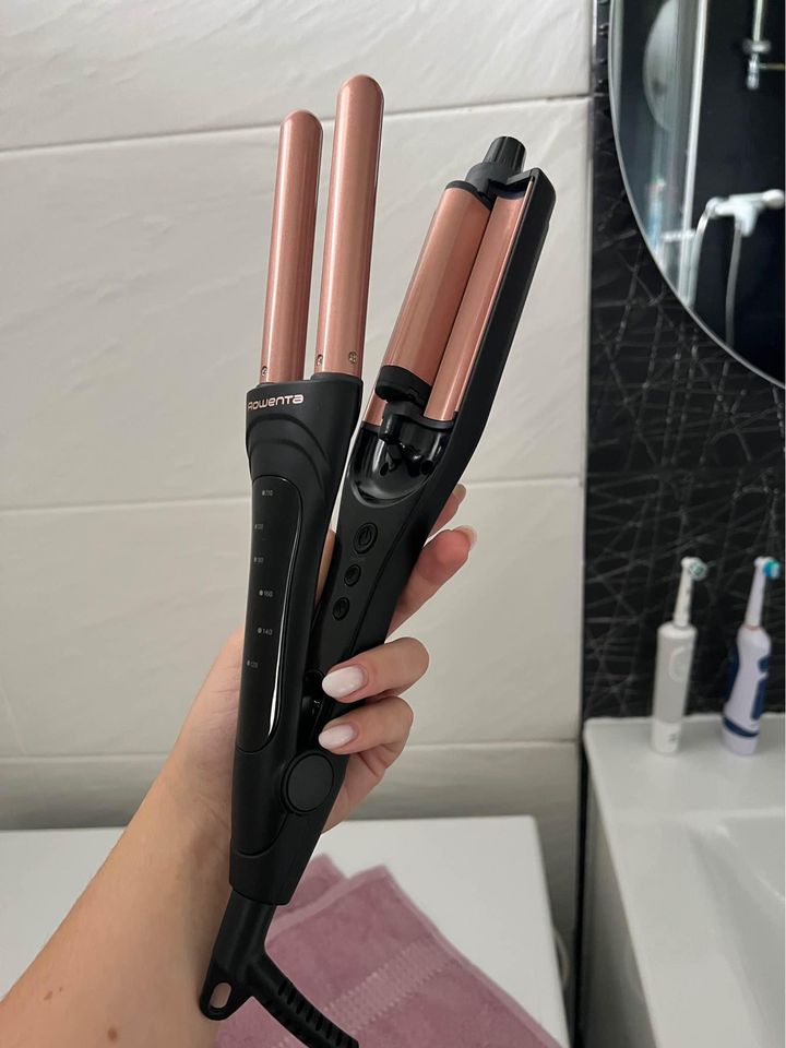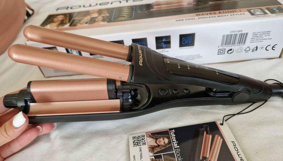 Trojkulma Rowenta CF4710F0 má příhodné označení Waves Addict (= závislák na vlnách), protože se na ní stanete závislí. Hned na první pohled zaujme svým vzhledem. Černá v kombinaci s barvou růžového zlata a přehledným LED displejem zkrátka působí luxusním dojmem. Jedná se o klasickou trojkulmu určenou na domácí použití(k dostání jsou také cestovní verze trojkulem), takže počítejte s většími rozměry.