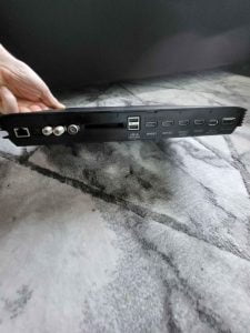 Dále tu máme tři USB porty, optický audio výstup, síťový konektor (pochopitelně je tu i Bluetooth a Wi-Fi) a jako tradičně tu není konektor pro sluchátka. Dále 1 CI slot a také dvojitý televizní tuner, ten však přináší jedno omezení o kterém si řekneme v sekci o operačním systému.