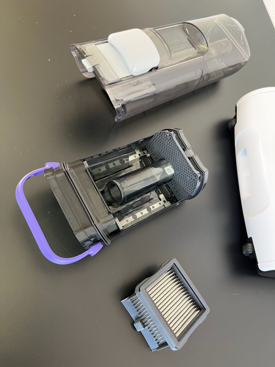 Dyson na to jde úplně jinak – ve spodní mopovací části má takovou zásuvku na nečistoty, kam gravitací padají. Nápad je to dobrý, ale samotné čištění je nepříjemné – velmi špatně se mi s filtry pracovalo, jejich vytažení je složité a potřebujete na to naučený grif. Opět relativně hodně nepřívětivé čištění.
