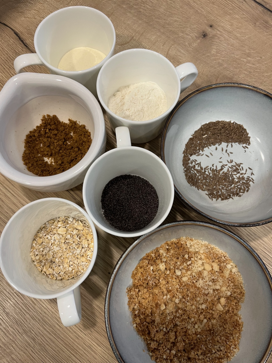 1. Směs drobků na dřevěné podlaze: hladká mouka, hrubá mouka, celý mák, ovesné vločky, rozdrobené granule pro psa, rozdrobené cukroví a kmín,