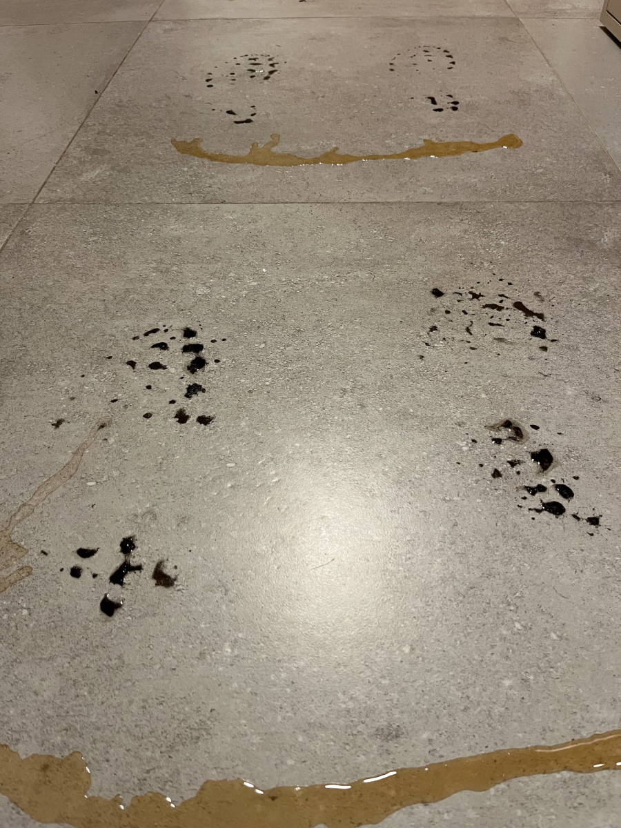 2. Zaschnuté stopy od špinavých bot a černý čaj na dlažbě: na dlažbu jsem nalil černý čaj a nechal ho zaschnout a vedle toho jsem otiskl blátivé šlápoty (zaschlé bahno z bot),
