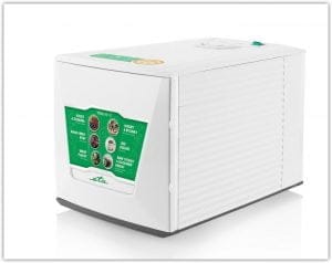 Velká sušička s nadstandardním příkonem 550 W. Vejde se do něj šest plat, u kterých lze snadno změnit výška (stačí plata otočit vzhůru nohama) a díky tomu sušit i objemnější kusy potravin. Většího příkonu se bát nemusíte, záleží samozřejmě na zvolené teplotě ale v průměru vás 10 hodin sušení vyjde na nějakých 5 Kč. Sušení má navzdory umístění topení a ventilace na boku přístroje svoje mouchy. Díky své konstrukci není takový problém s teplotou nahoře a dole, ale spíš u krajů a uprostřed. Takže i zde je dobré je v průběhu sušení prohazovat. Na rozdíl oproti podobně drahé konkurenci umí nastavit časovač až na 40 hodin. Poté potřebuje chvíli pauzu, zmíním o pár řádku níže.
